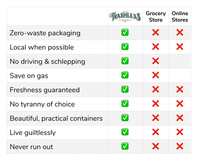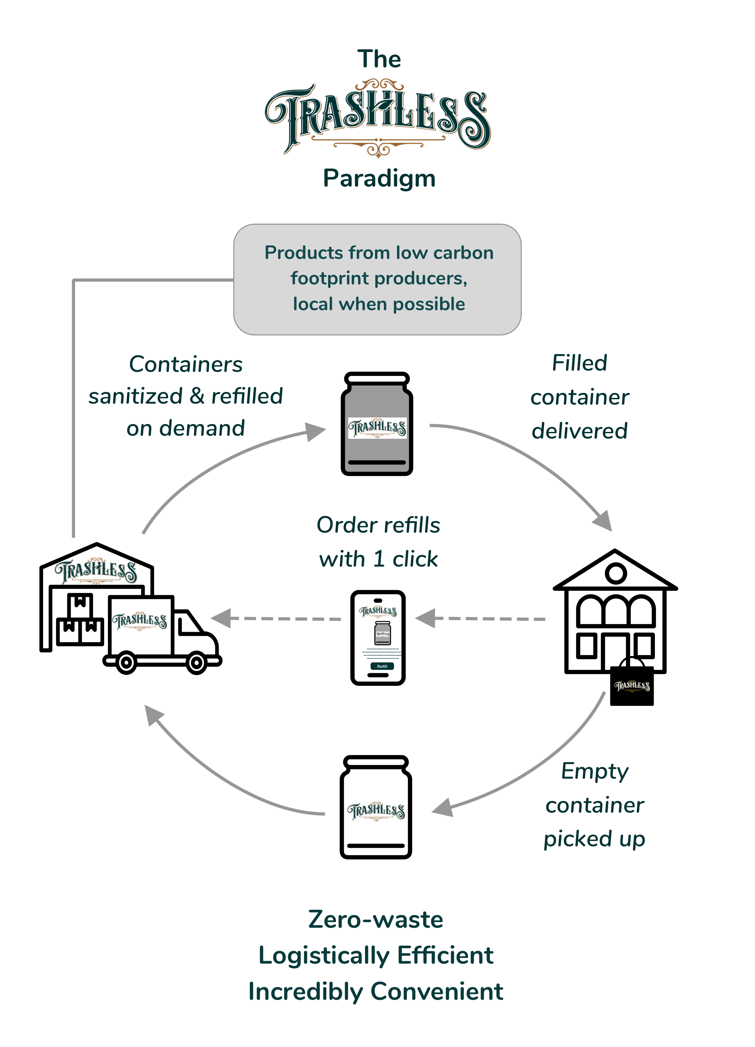 Trashless is a new online grocery paradigm that eliminates all these ills, and more. - It delivers commonly used household items, well, trashlessly - without most packaging waste.