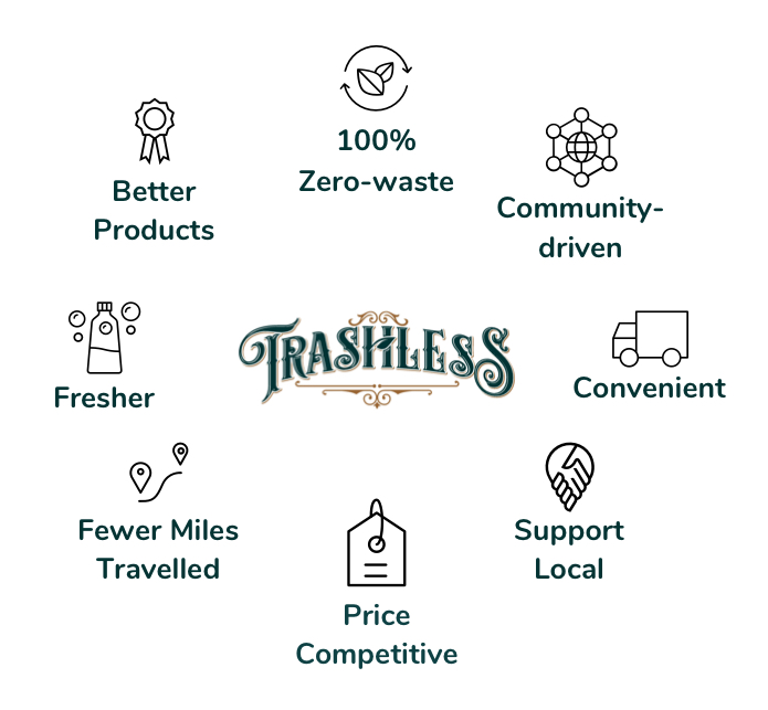 Delivering products that are locally sourced and sustainably produced, when possible, Trashless adds extra layers of sustainability to this new low carbon footprint way households consume products.